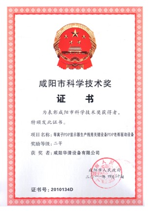 咸陽華清設備科技有限公司“等離子PDP顯示器生產線用關鍵設備PDP老煉驅動設備”獲得2010年度咸陽市科學技術獎